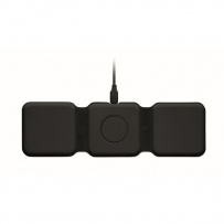 3 in 1 foldable charging station in ABS. It has 3 wireless charging spots (15W). Input: 2-in-1 Type-C and Type-A.
