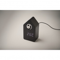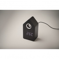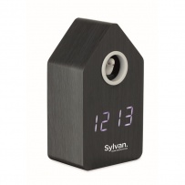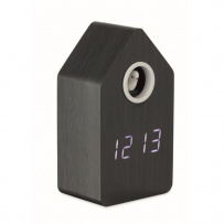 MDF cuckoo clock including a built-in alarm / temperature display. Bird will come out every full hour and during alarm and it has bird cuckoo voice. White LED display. Sound is automatically silenced between 22.00h to 06.00. 5 mins snooze intervals.
