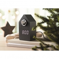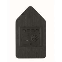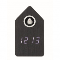 Zegar z kukułką z MDF z wbudowanym alarmem / wyświetlaczem temperatury. Ptak wychodzi o każdej pełnej godzinie wydając odgłos kukułki. Biały wyświetlacz LED. Dźwięk jest automatycznie wyciszany między 22:00 a 06:00. 5-minutowe interwały drzemki.
