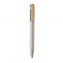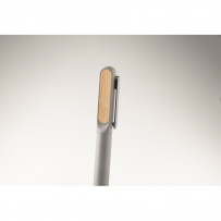 Drehkugelschreiber mit Schaft aus recyceltem Aluminium, oberer Part aus recyceltem ABS mit Inlay aus Bambus und Clip aus Metall. Blaue Tinte.