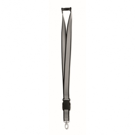 Lanyard en polyester RPET réfléchissant avec cordon de 2,5 cm, crochet métallique, boucle détachable en PP et fermeture de sécurité. Pour usage promotionnel uniquement.